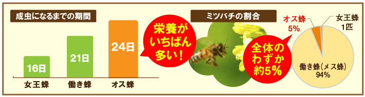 また、ミツバチは卵から成虫になるまでの期間に、餌となるローヤルゼリーやハチミツ、花粉などをたっぷりと体内に蓄積しますが、成虫になるまでの期間はそれぞれ異なっており、女王蜂が16日、働き蜂(メス)が21日、オス蜂が24日です。