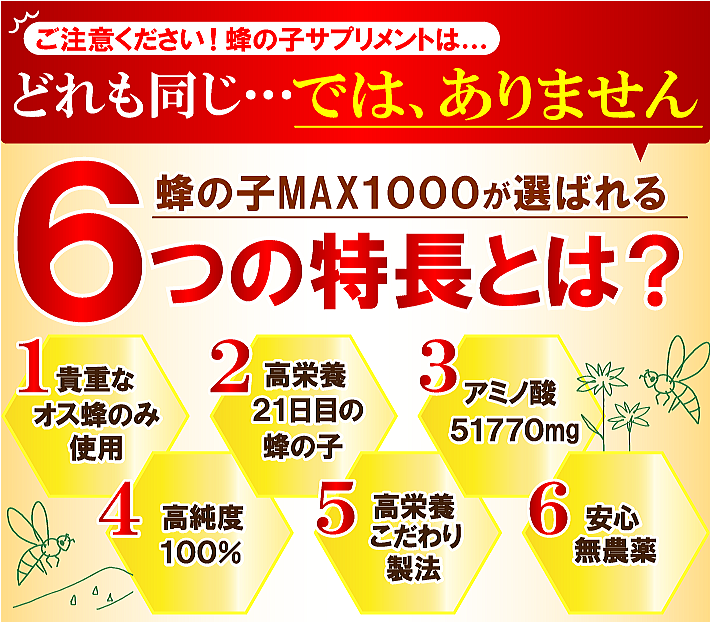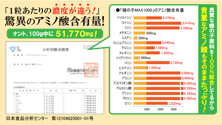 なかでも当社の「蜂の子MAX1000」は蜂の子を100%配合していますので、アミノ酸含有量は100g中になんと51,770mgも含まれています。