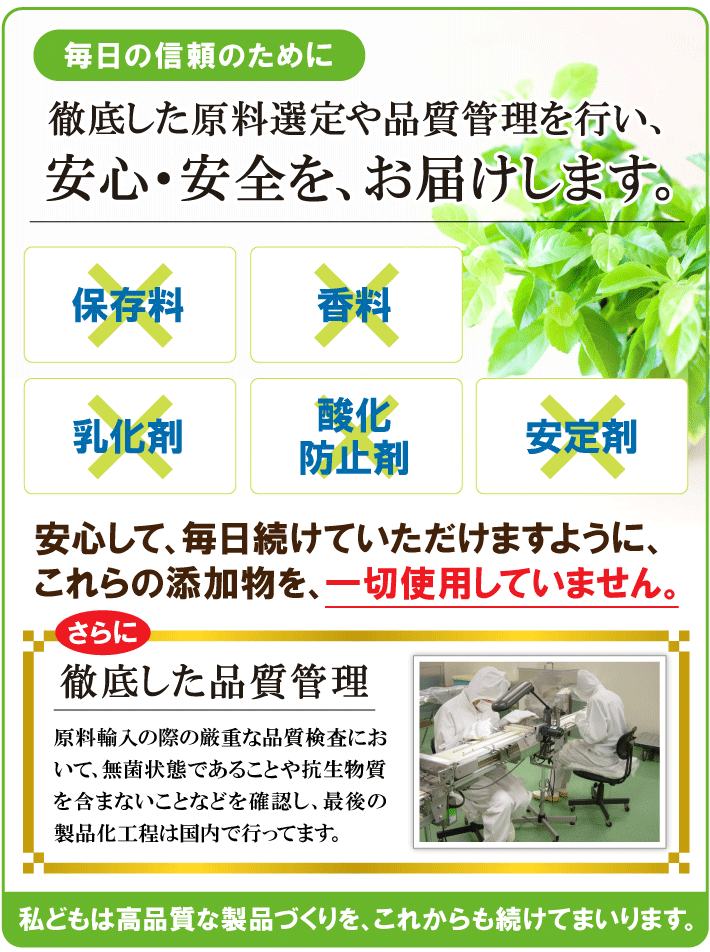 弊社商品は全て日本国内において、品質の安全性を確認する検査を行った後、国内の食品製造基準に基づいて、安全に製品化されております。